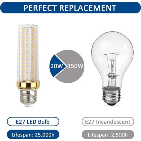 【E27】: Ampoule maïs LED 20W E27 blanc chaud 3000K avec 2835 SMD LEDs, les SMD LED sont réparties uniformément sur le corps de la lampe, assurant 360 degrés de lumière et pas de zones sombres.