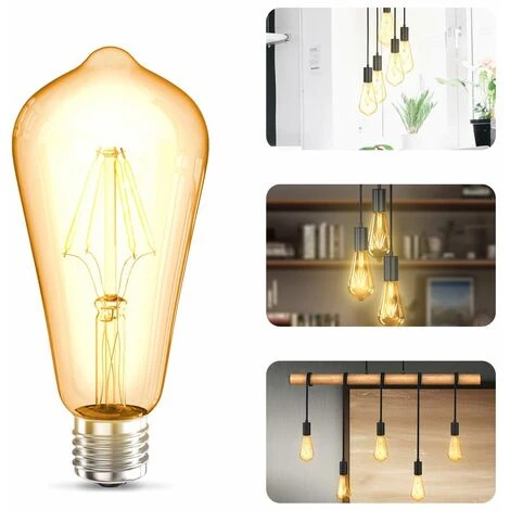 Résumé pour vous : Set de deux ampoules rétro LED Verre ambré Douille E27 Lumière blanche chaude 2 700 Kelvin Luminosité de 380 lumens et 4 Watts Forme ST64 64×143 (DxH) Non dimmable