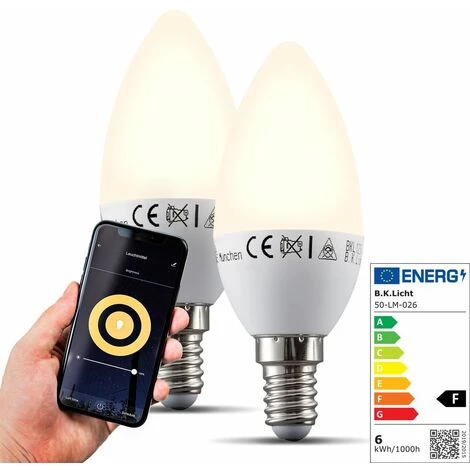 B.K.Licht lot de 2 ampoules LED connectées • E14 • puissance 5,5 Watt • contrôle par Appli (Tuya Smart App) • compatibles Alexa et Google Home • durée de vie 30.000 heures environ • blanc chaud 2.700 Kelvin • intensité lumineuse 470 Lumen • 230V • indice de protection IP20