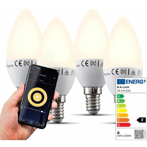 B.K.Licht lot de 4 ampoules LED connectées • E14 • puissance 5,5 Watt • contrôle par Appli (Tuya Smart App) • compatibles Alexa et Google Home • durée de vie 30.000 heures environ • blanc chaud 2.700 Kelvin • intensité lumineuse 470 Lumen • 230V • indice de protection IP20