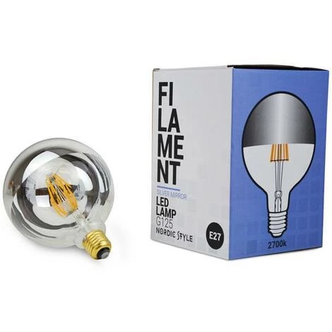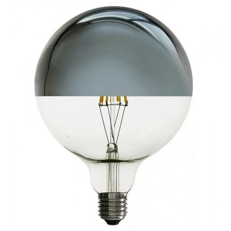 Ampoule LED à filament de type globe Miroir à douille E27. La moitié de l’ampoule est en verre transparent et l’autre moitié est en effet miroir.