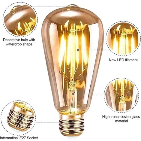 Ampoules rétro LED : ampoules rétro Edison, belles ampoules rétro, ampoules innovantes, basées sur un bon mélange de nouvelle technologie LED et d’ampoules rétro. Le verre cristal transparent donne une atmosphère romantique et un sentiment nostalgique.