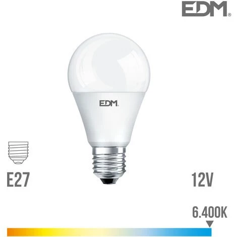 AMPOULE STANDARD LED 12V AC/DC E27 10W 810 Lm 6400K LUMIÈRE FROIDE EDMAMPOULE LED STANDARD « 12V » AC/DC E27 10W 810lm 6400K LUMIÈRE FROIDE Ø5.9x11cm (diamètre/hauteur) 25000h CLASSE ÉNERGÉTIQUE: A+. ANGLE D’OUVERTURE: 220º EDM