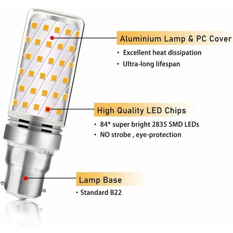 Qualité Durable: Culot baïonnette B22, taille (Ø32*108mm), facile à installer. Éclairage instantané. Avec une durée de vie moyenne de 30,000 heures, il dissipe la chaleur plus rapidement et est plus sûr que les ampoules à incandescence.