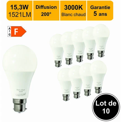 Lot de 10 ampoules LED standard A65 B22 15,3W (equiv. 100W) 1521Lm 3000K