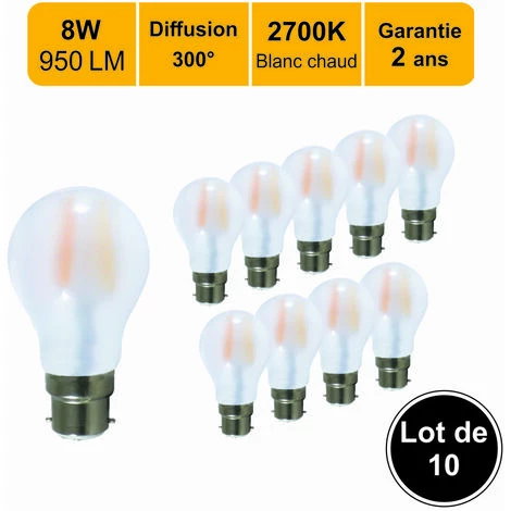 Lot de 10 ampoules LED filament B22 8W (equiv. 80W) 950Lm 2700K