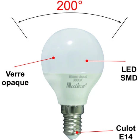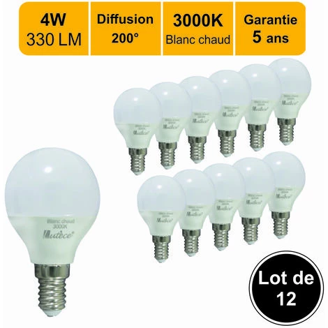Lot de 12 ampoules LED sphérique E14 4W (equiv. 30W) 330Lm 3000K