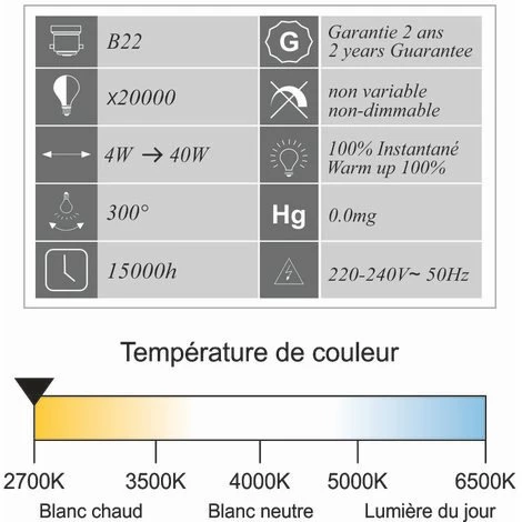 - Il s’agit d’ampoules LED non réglables, non compatibles avec les variateurs de lumière.