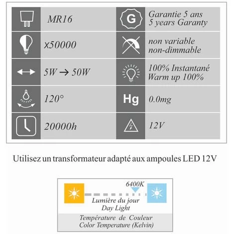 - Il s’agit d’ampoules LED spot non réglables, non compatibles avec les variateurs de lumière.