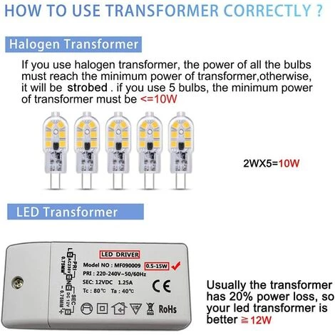 - 【Suggestion en utilisant un transformateur】 : veuillez vous assurer que votre transformateur (220 V à 12 V) est compatible avec les ampoules LED. En cas d’incompatibilité, la LED peut clignoter ou être endommagée. Si un transformateur de lampe halogène est utilisé, la puissance de toutes les ampoules doit atteindre la puissance minimale du transformateur. Bon à utiliser comme lustre au-dessus de la table à manger.