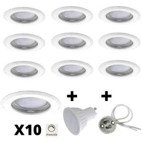 Nouveau Kit complet 10 Spots encastrables + ampoules led GU10 dimmables + douilles GU10.Cet ensemble spot led encastrable se compose d’un spot encastrable fixe blanc + une ampoule à led GU10 dimmable blanc neutre + une douille GU10Connectez ce spot led complet directement sur le secteur 220/240V et remplacez vos spots halogènes équivalent environ 50WAvantage du spot led composé : Vous pouvez changer par la suite l’ampoule led sans changer votre spot encastrable.Caractéristiques du kit :Spot encastrable fixeMarque : KANLUXCouleur : BlancOrientable : NonMatériaux : Tôle d’acier.Diamètre d’encastrement : 60 mmDimensions extérieur : 82 mmAmpoule ledMarque : GTVType : LEDPuissance : 7WTension : 230VFlux lumineux : 560 lmAngle de diffusion : 120 Température de couleur : Blanc neutre 4000 KDurée de vie : 20 000 heuresGradable : oui, compatible variateur d’intensité, dimmableGarantie : 2 ansDimensions : Diamètre 50 mm x Longueur 55 mmDouille GU10 : céramique