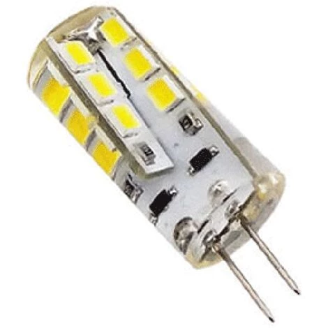 Lampe LED cylindrique silicone, culot G4, 2W2 12VDC, 160 Lumens, angle 360°, teinte blanc froid. Cette lampe en forme de cylindre pourvue de deux picots à sa base, remplacera durablement et économiquement les lampes des éclairages intégrés de cuisine ou vitrines, les lampes de bureau, les solutions d’éclairage installées dans les camping-cars et bateaux.