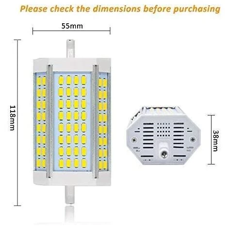 【3000LM Haute Luminosité】: R7S LED 118mm 30W dimmable avec 64*5730 SMD LEDs, couleur de lumière blanche froide 6000k avec un angle de diffusion lumineux de 200 degrés. La luminosité élevée de 3000 lumens est très appropriée pour une utilisation comme plafonnier en studio.