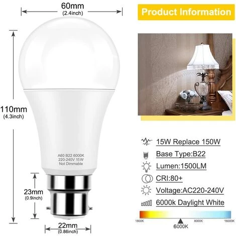 CARACTÉRISTIQUES: Ampoules LED standard A60 avec culot B22. Lumière blanche froide 6000K, 1500 lumens. Éfficacité énergétique A +.