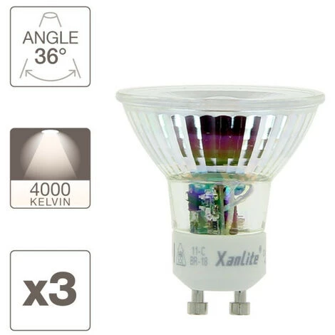 - Lot de 3 ampoules spots (réflecteurs) au culot GU10. Avec leur consommation de 5.5 W (équivalent à la puissance d’éclairage d’une ampoule incandescente de 50W) et leur angle d’éclairage de 36°, elles seront idéales pour un éclairage d’appoint, ou pour un éclairage d’ambiance, au plus proche de la lumière du jour (4000 kelvins).